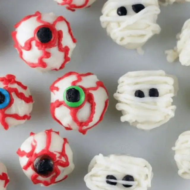 Eyeball and Mummy Cake Balls: How fun are these? Cake ball eyeballs & mummies. Spooky and sweet all at the same time. (via Brit + Co) #TGIF