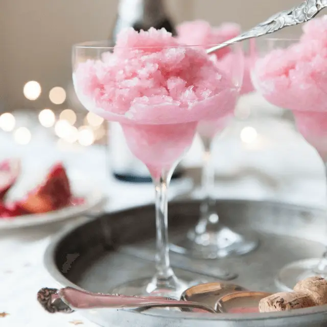 Wondering about dessert? Sparkling wine can be used to make granita (fancy Italian name for shaved ice!) Check out this gorgeous Rose Champagne Granita recipe from Feast & West! Serve it in a martini glass or champagne coupe and you’ve got yourself an elegant dessert that keeps the party rolling!