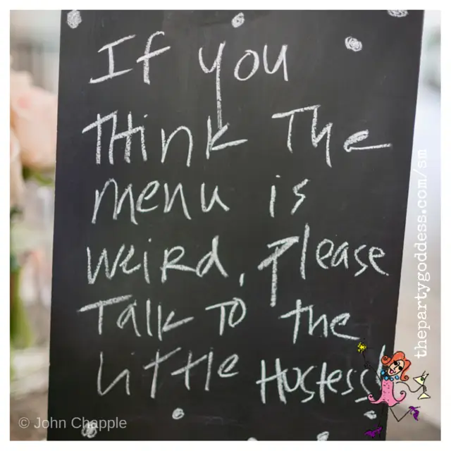 The menu was, well, very weird. I don’t know what else to say, but it contained all of her favorites so I went with it, but had to put down some kind of a disclaimer. Check it out below. (I think my handwriting could use a little improvement now that I see it on the little screen!)