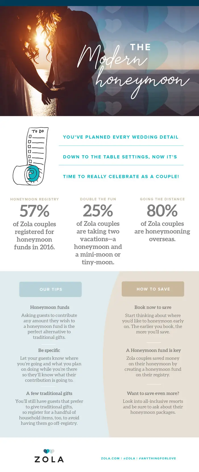 Zola, wedding registry experts, can help you plan your honeymoon! With their beautifully designed, easy-to-use registries, wedding guests can donate to your trip fund as a wedding gift. Here are some other tips they’ve shared with us!