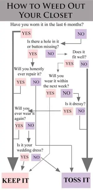 First things first: get rid of stuff you don’t like or wear anymore! Like that leather fringe jacket leftover from the grunge rock years! Wondering what else qualifies for the throw away pile? Here’s a handy graphic to help you get started!